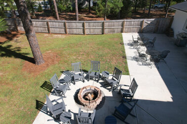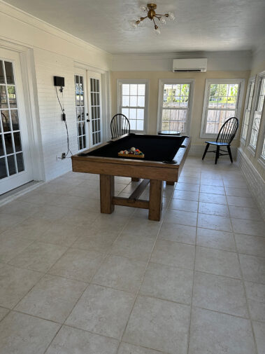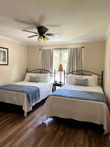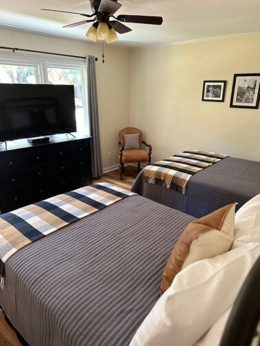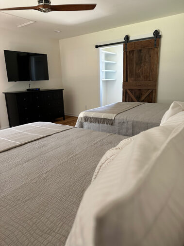 The Brooks Cottage comfortably sleeps 8! It has 4 Bedrooms and 3.5 bathrooms and features 4 Queen Size Beds and 4 Full Size beds. Guests will enjoy a full kitchen, TV’s in every bedroom, large screen TV’s in the game room and living room, an outdoor patio featuring a firepit, and so much more!